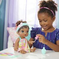 Pamper baby with spa day accessories to make her feel glamourous! With ice cold water, fill the pretend nail polish bottle and give Baby Alive Glam Spa Baby doll a colour reveal mani-pedi. Then fill a bowl with ice cold water and soak doll’s mask -- apply to her face and remove for a gorgeous eye makeup reveal! This adorable 31.5cm (12.4-inch) waterplay doll comes wearing an aqua moulded swimsuit and attached themed headband. She also features flamingo-themed spa doll accessories, including a towel wrap, doll mask and pretend nail polish bottle. Plus, she even comes with a comb for kids to brush and style her coral colour-streaked ponytail. Glam Spa Baby makes a fun makeup-themed doll for girls and boys ages 3 and up.