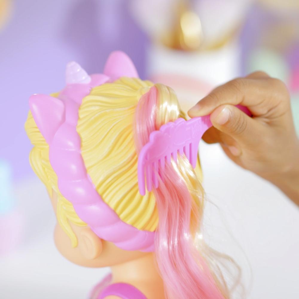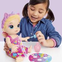 Pamper baby with spa day accessories to make her feel glamourous! With ice cold water, fill the pretend nail polish bottle and give Baby Alive Glam Spa Baby doll a colour reveal mani-pedi. Then fill a bowl with ice cold water and soak doll’s mask -- apply to her face and remove for a gorgeous eye makeup reveal! This adorable 35.5cm (12.8-inch) waterplay doll comes wearing a pink moulded swimsuit and attached themed headband. She also features unicorn-themed spa doll accessories, including a towel wrap, doll mask and pretend nail polish bottle. Plus, she even comes with a comb for kids to brush and style her pink colour-streaked ponytail! Glam Spa Baby makes a fun makeup-themed doll for girls and boys ages 3 and up.