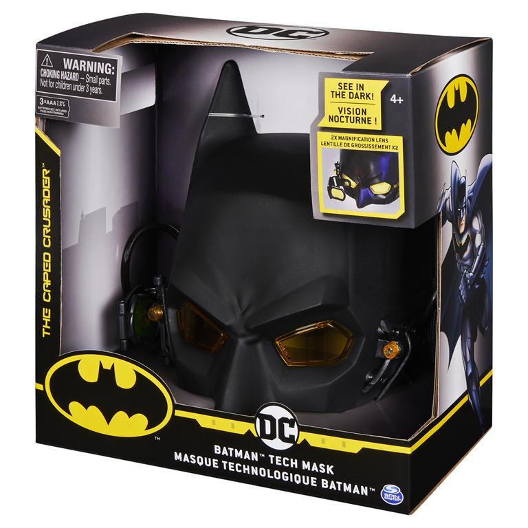Gear up as the CAPED CRUSADER and take down the Super-Villains of GOTHAM CITY with the BATMAN Tech Mask! This iconic cowl mask will take your Bat-Gear to the next level. Featuring built-in LED lights on each side of the mask and a retractable magnifying lens, you will be able to aid your exploration in the dark, just like BATMAN! Slide the Tech Mask over your head and patrol the streets of GOTHAM CITY. With the hands-free lights, spot evil lurking in the shadows anywhere you look! Then, put the Tech Masks lens to use when you need a closer look at the clues and zoom in like a true detective with 2X magnification! This role-play mask is the perfect addition to your BATMAN collection. Complete your CAPED CRUSADER look with the BATMAN Gauntlet (sold separately) and use your imagination to play out your own BATMAN missions! Become the ultimate Super Hero and see in the dark with the BATMAN Tech Mask!
