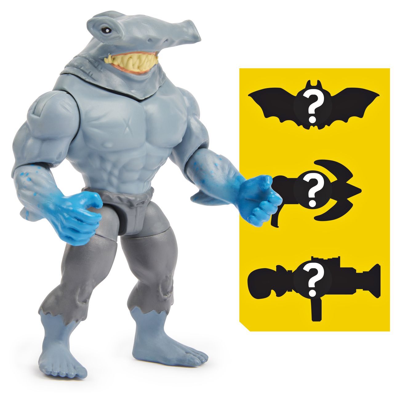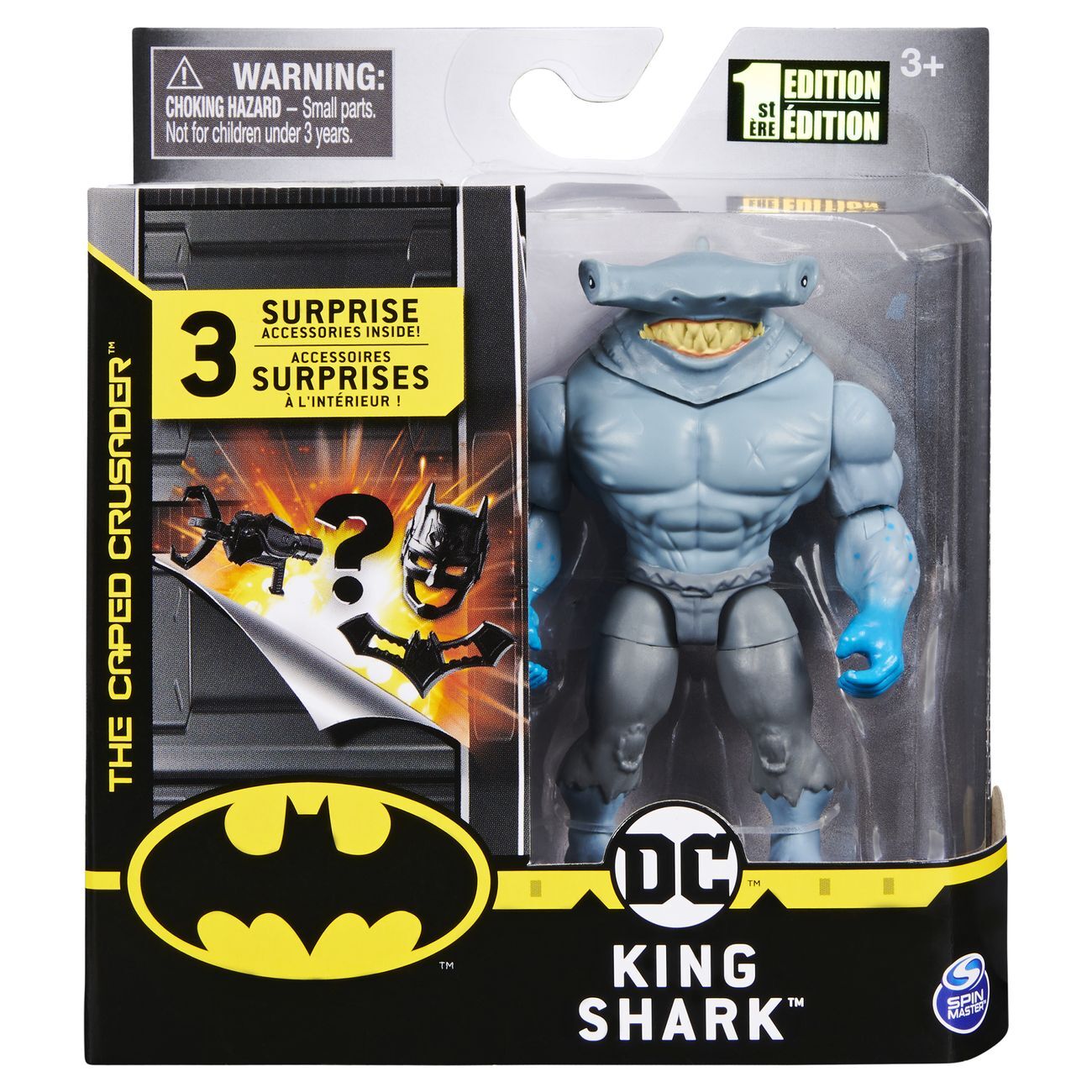 Epic missions begin with the Batman 10cm Action Figures! Join the menacing King Shark on an exciting mission! Will you find a Sewer Showdown, Rooftop Rivals, Street Defender or Jungle Rumble mission? Open the box to discover your mission on a collector card and three mystery accessories hidden in compartments! Find gauntlets, shields, blasters and more, plus one Bat-Gear accessory inside. Reveal accessories (including rare and super rare) that match your mission’s theme in material finishes like translucent, camo, clear swirl and stone. Armed with his mission-specific accessories, help King Shark battle against the Super Heroes of Gotham City! With a highly detailed sculpt and 11 points of articulation, you can pose your figure any way you want! Each 10cm Batman articulated action figure also comes with a collector’s guide, so you can easily keep track of your collection. Expand your action figure collection with Batman, The Joker, Robin, Bronze Tiger, Talon and more (each sold separately) and use your imagination to create your own Super Hero and Super-Villain adventures!