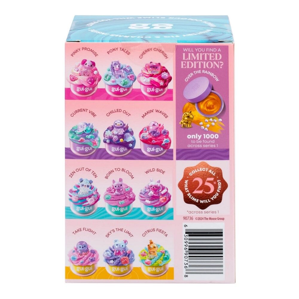 Each pack contains one surprise Gui Gui character, one themed slime tub, and a collector sheet. Characters vary and may include Pinky Promise, Melt My Heart, Cherry Cherish, Lucky Charm, Chilled Out, Sky’s The Limit, Zen Out of Ten, Sunset Dream, Wild Side, Lazy Daisy, Just Coasting, Thank You, Rex. There is also a chance to find the limited edition “Over the Rainbow” Gui Gui, with only 1000 pieces available across Series 1.