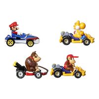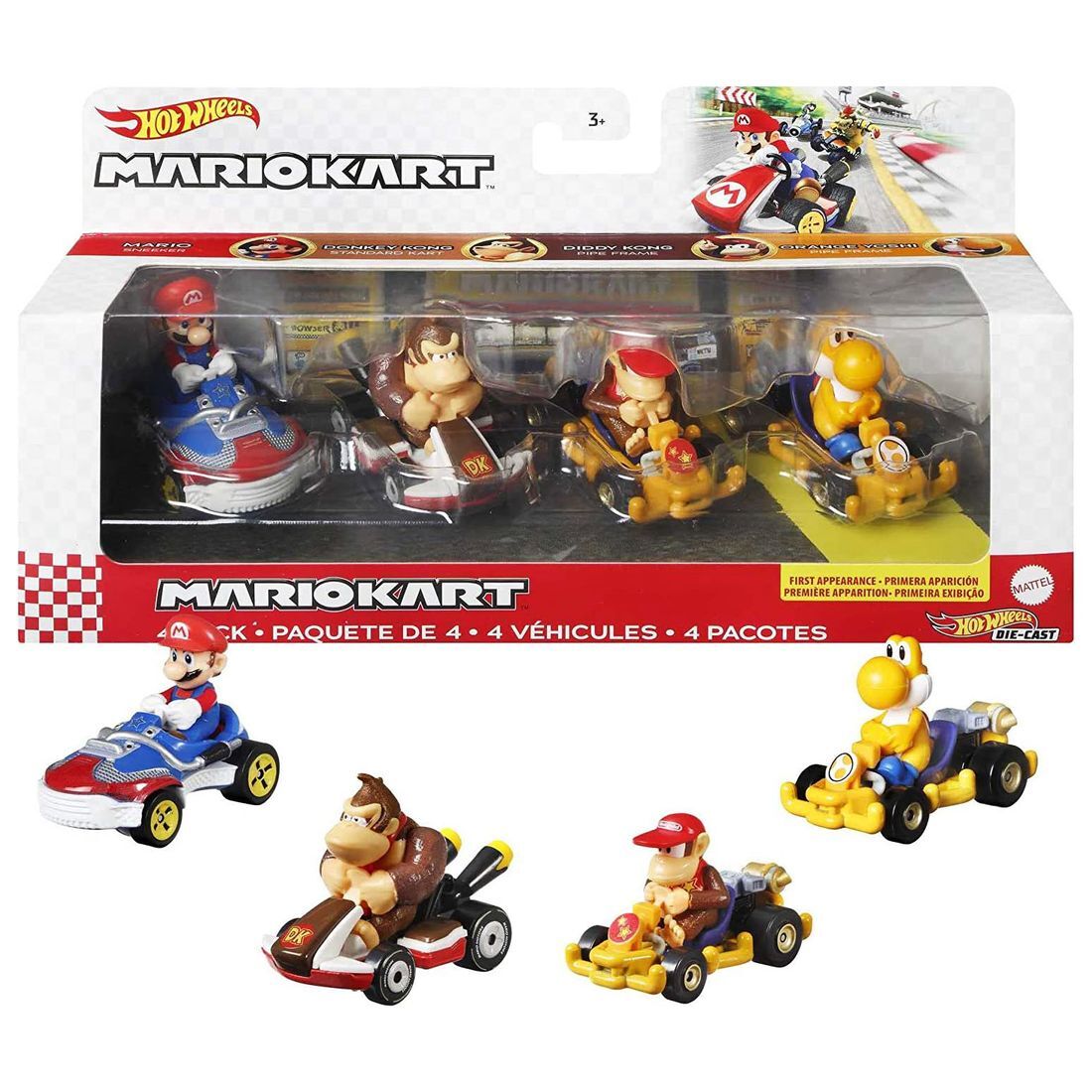 This 4-Pack of Mario Kart replica 1:64 die-cast karts will delight Mario Kart and Hot Wheels fans of all ages! The 4-Pack includes top favourite iconic Mario Kart characters and one exclusive Black Yoshi! Kids can power-up their imagination by combining the thrill of Hot Wheels performance with the action and racing of Mario Kart. Speed off and perform crazy stunts with Mario, Donkey Kong, Diddy Kong, and the exclusive Orange Yoshi! All Mario Kart die-cast vehicles are compatible with existing Hot Wheels track sets.