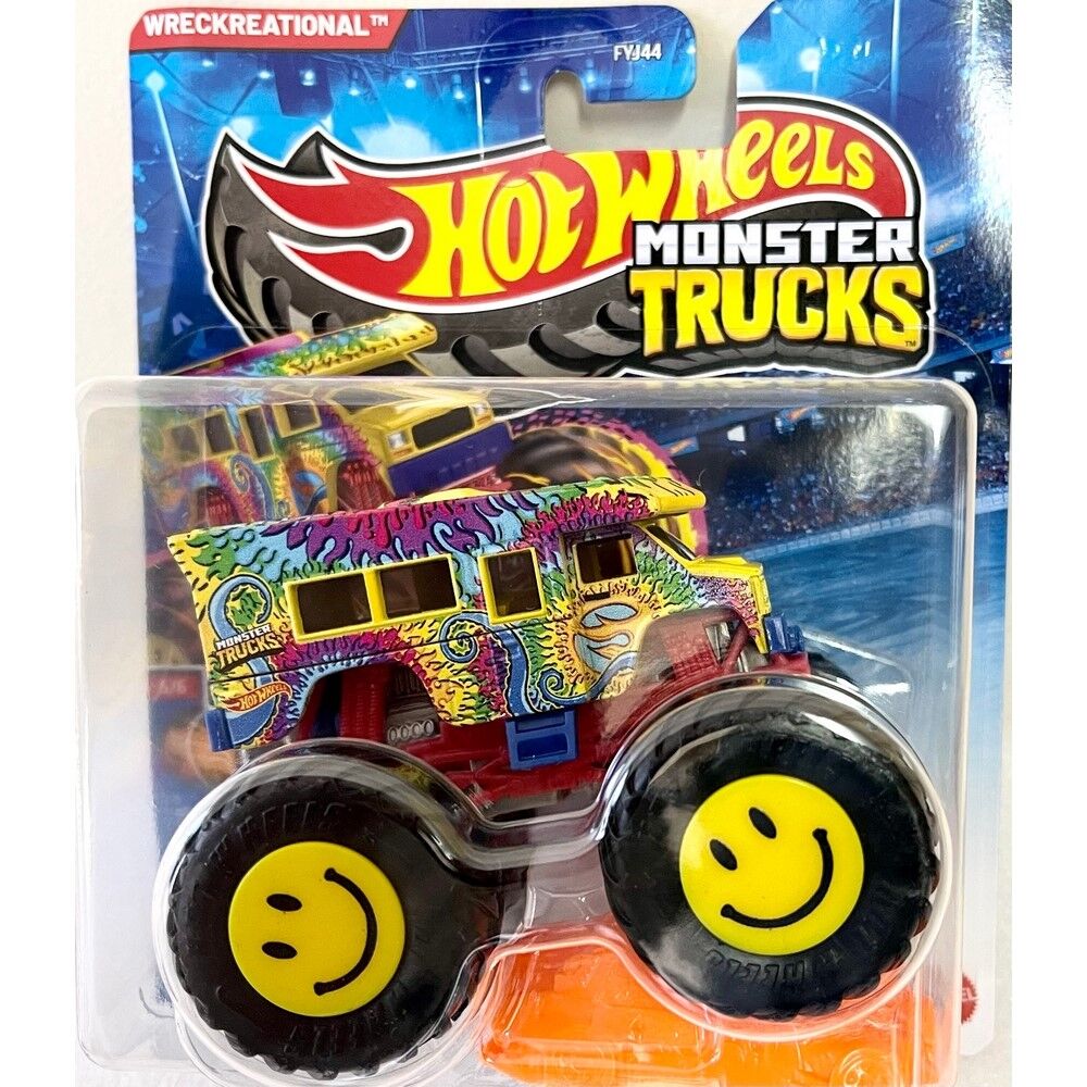 Get ready for wild rides and retro vibes with the Hot Wheels Monster Trucks Wreckreational™ in 1:64 scale! This unique die-cast monster truck is styled like a psychedelic party bus, complete with colorful tie-dye graphics and oversized wheels featuring bold yellow smiley faces.