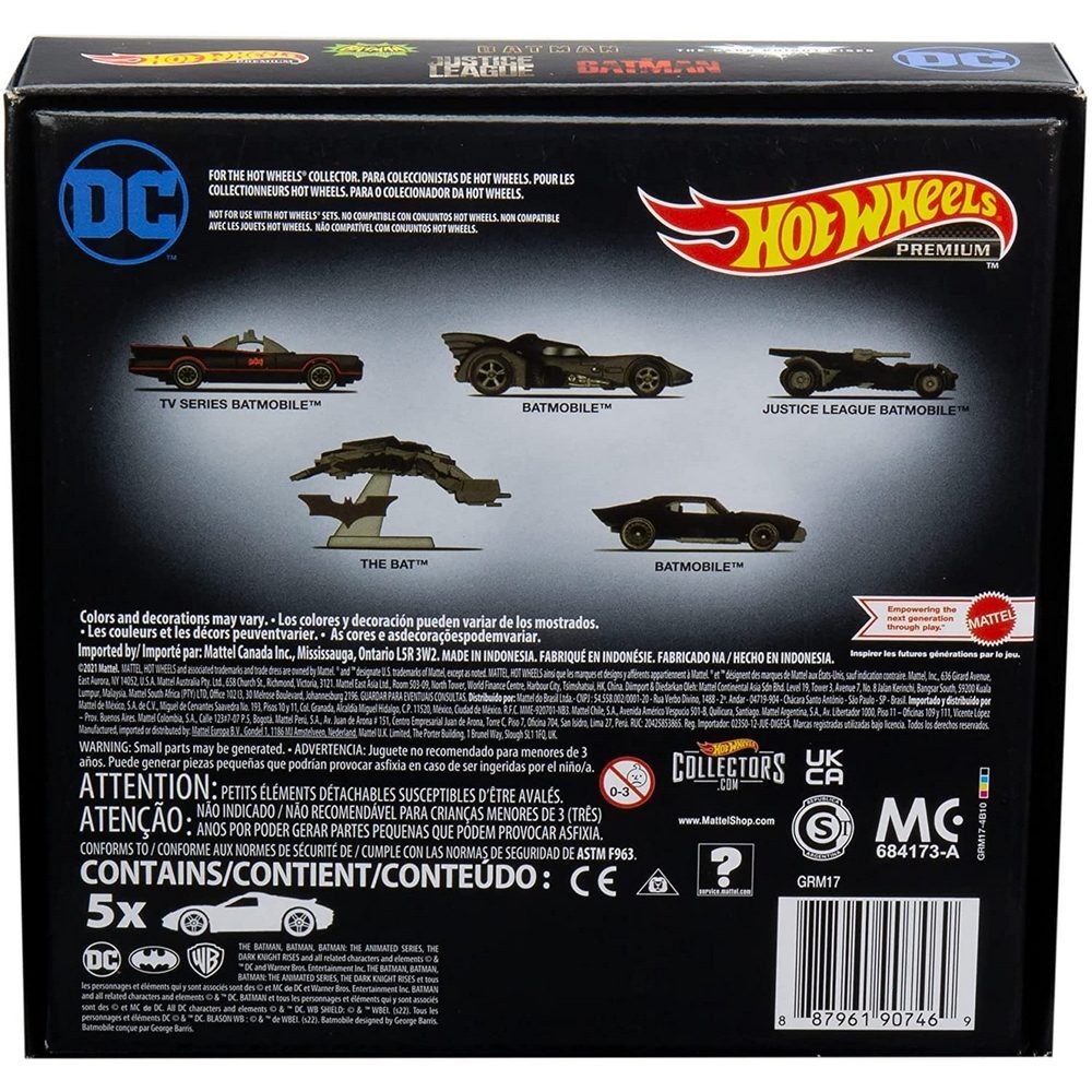 • The Hot Wheels Premium Batman Bundle delivers 5 fan-favourite castings of the Batmobile in elite packaging for the adult collector and fans of the Batman franchise.
