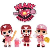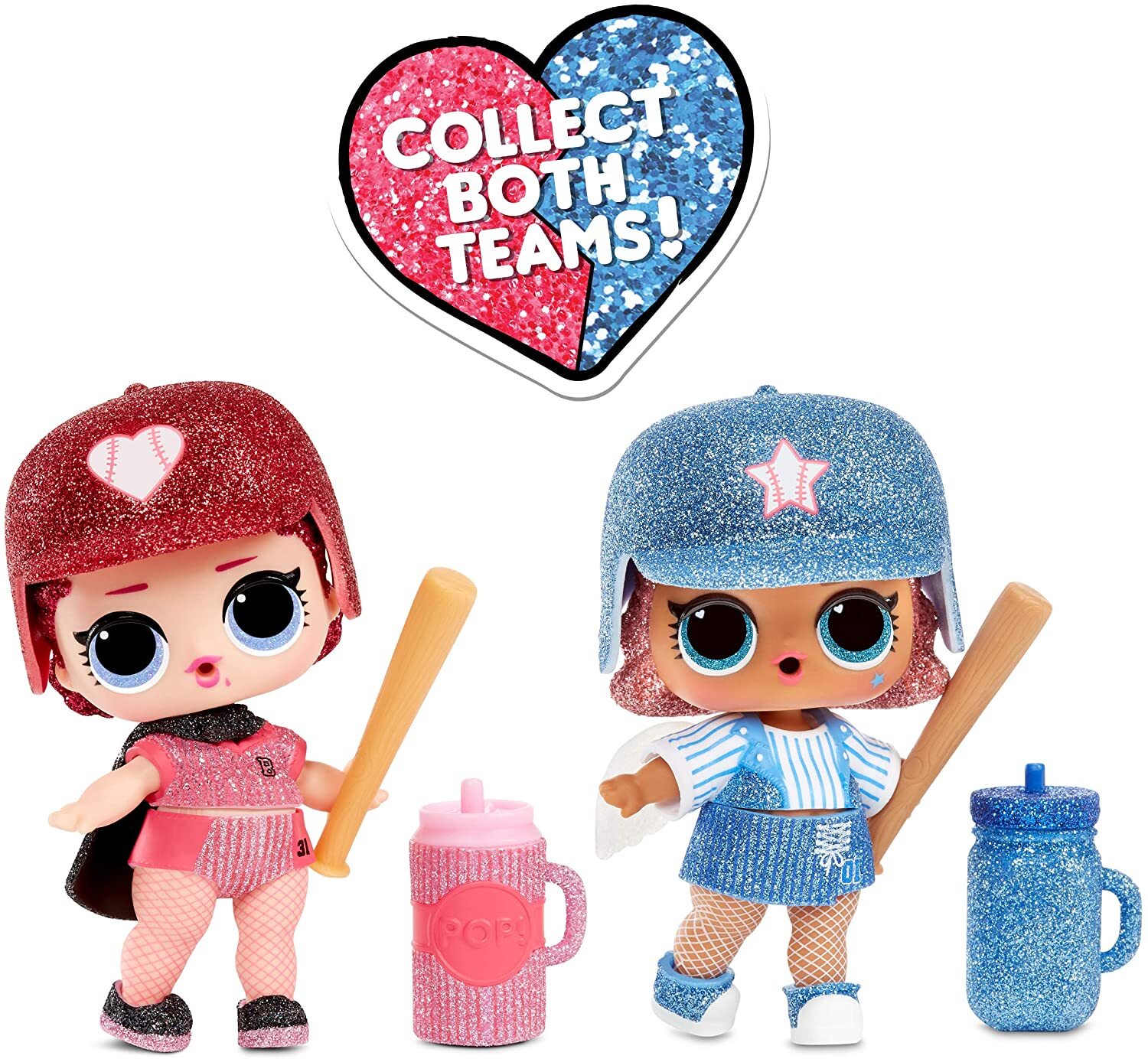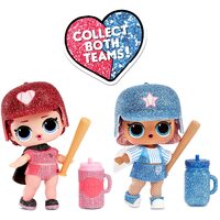 Get ready to play ball and unbox 8 surprises with L.O.L. Surprise! All Star B.B.s. These fan favourite characters got a sparkly makeover and joined a fierce baseball team, because they all come with all new uniforms and baseball-themed accessories. Collect both teams – the Heart Breakers and the Lucky Stars. Will you find a batter B.B. or a doll who loves to catch fly balls? Feed or bathe your doll for another water surprise. And each doll includes her own collectible trading card that doubles as a backdrop. The new ball has a slot to place the trading card behind your doll for a cute photo op. Collect all 12 sparkly, baseball characters on 2 teams, including the ultra-rare Beatnik Babe, who is the umpire for her B.B.s. 8 surprises: (1) Secret Message; (2) Trading Cards; (3) Bottle; (4-5) Accessories; (6) Fashion; (7) Shoes; (8)