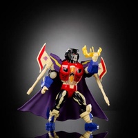 Bring together two iconic universes with the Masters of the Universe x Transformers Starscream Armor Scare Glow action figure. This unique crossover collectible combines the power of Transformers with the classic style of Masters of the Universe, making it a standout piece for fans and collectors.