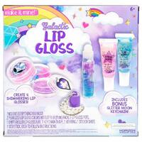 Includes 2 x pearlised lip gloss colours, 3 x lip gloss pots, empty roller lip gloss tube, key chain shape, key ring, sticker sheet, stir stick and easy-to-follow instructions