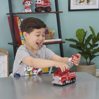 Team up with Marshall for bigger, bolder rescues with his PAW Patrol: The Movie transforming Deluxe Vehicle! Marshall’s sleek city toy fire truck features silver metallic paint, authentic movie details and graphics, and an exciting transformation straight from the movie! Suited up in his all-new movie uniform, Marshall (collectible action figure included) is ready to save the day in Adventure City. When trouble strikes, place Marshall behind the wheel of his fire truck and race to the rescue! Push down on Marshall’s truck to activate the vehicle’s unique transformation. The back opens up, revealing a pop-up water cannon launcher! Load the included projectile and press the button to launch! Reset, transform and launch again and again! Marshall’s toy truck is a great gift for kids ages 3 and up and is the perfect addition to any PAW Patrol vehicles and toy figures collection. The PAW Patrol: The Movie Deluxe Vehicles bring the action and excitement from the big screen to life! Collect them all (toy vehicles each sold separately) and use your imagination to play out your action-packed rescue missions. For even more movie action, use your Deluxe Vehicle with the all-new PAW Patrol tower, the Ultimate City Tower (sold separately)!