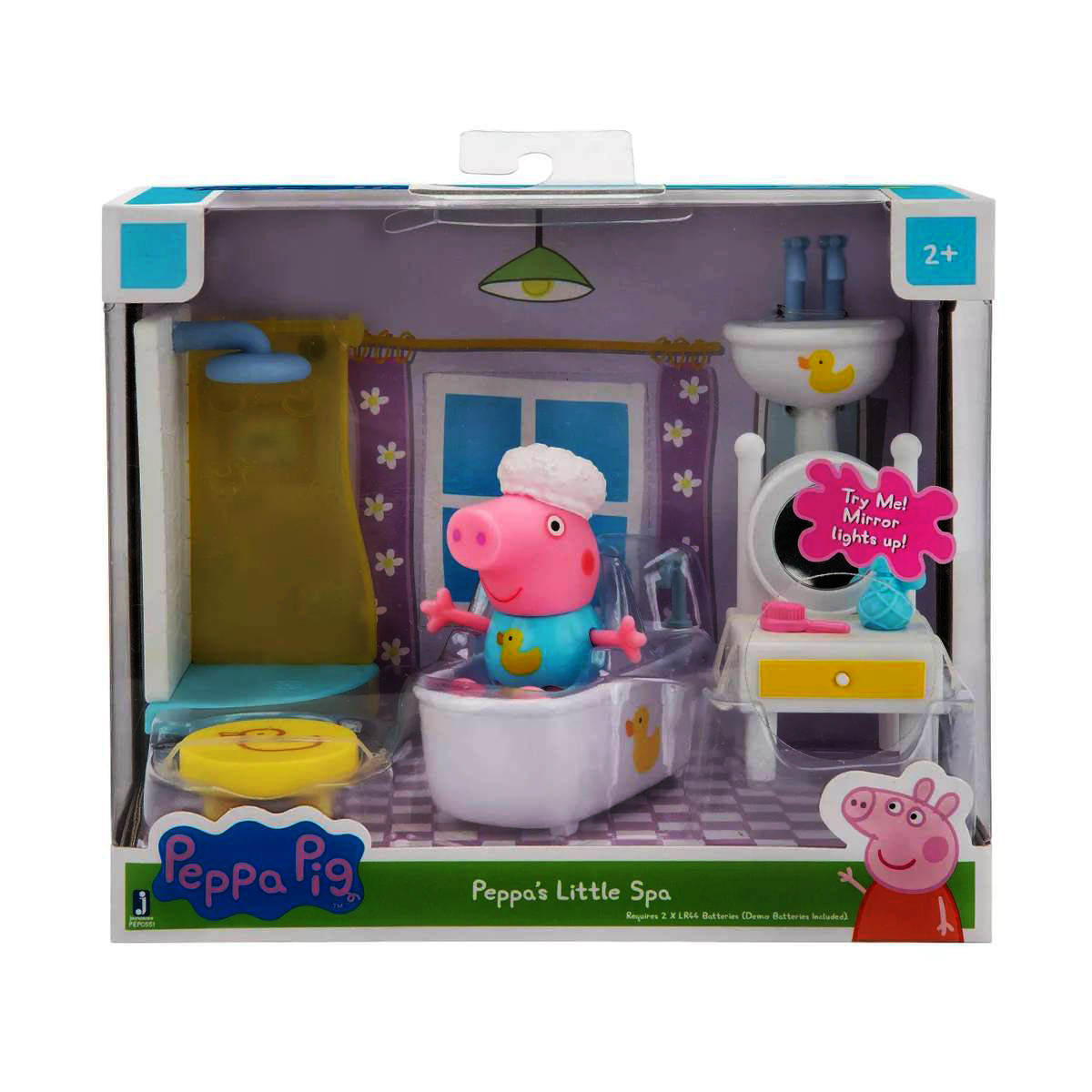 It's time to get ready in Peppa's Little Spa! The playset opens to reveal a room filled with oinktastic accessories. Ready with her shower cap on, Peppa enjoys a relaxing bath and shower. Don't forget to brush Peppa's teeth over the sink! Then watch her get ready in front of her light-up vanity! Peppa is fresh and clean and ready for a day full of fun!