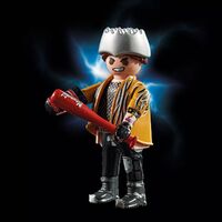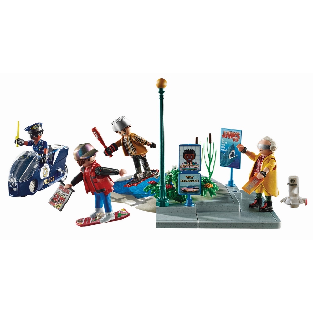 After his first time travel into the past, Marty McFly now heads to 2015. In the future, Griff, the grandson of Marty's archrival Biff Tannen, is hot on his heels, this time on flying hoverboards instead of skateboards. Will Marty manage to outrun Griff, save his family and get back to 1985? With the latest Back to the Future set from PLAYMOBIL, fans of the cult-classic film trilogy can re-enact the legendary hoverboard chase scene by attaching the figures via the footholds. In addition to Marty and Griff on their hoverboards, the playset also includes Doc Brown in a futuristic outfit, police officer with motorbike, posters, scenery, cool additions for the DeLorean (70317 - sold separately), and a collector's postcard for fans.