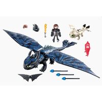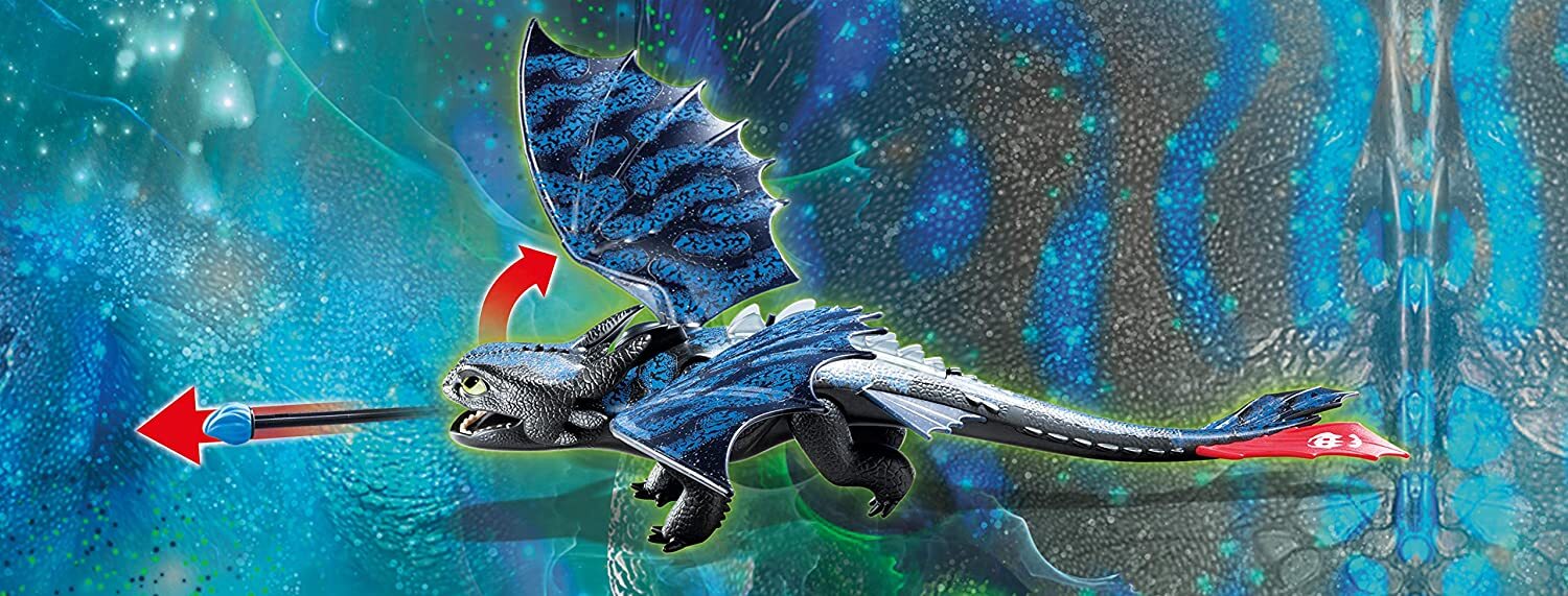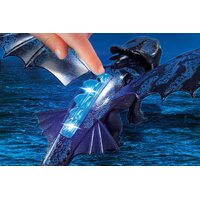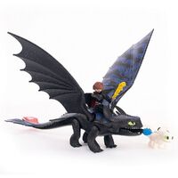 Hiccup and Toothless lead the Dragons and inhabitants of Berk on a fight against Grimmel. With illuminating back spikes and fire-charged markings, Toothless goes on a new adventure to explore the hidden world, and Hiccup learns to be a leader even without his Dragon. Set includes Hiccup, Toothless, blue fire darts, baby Dragon, flame sword, helmet, and other accessories.