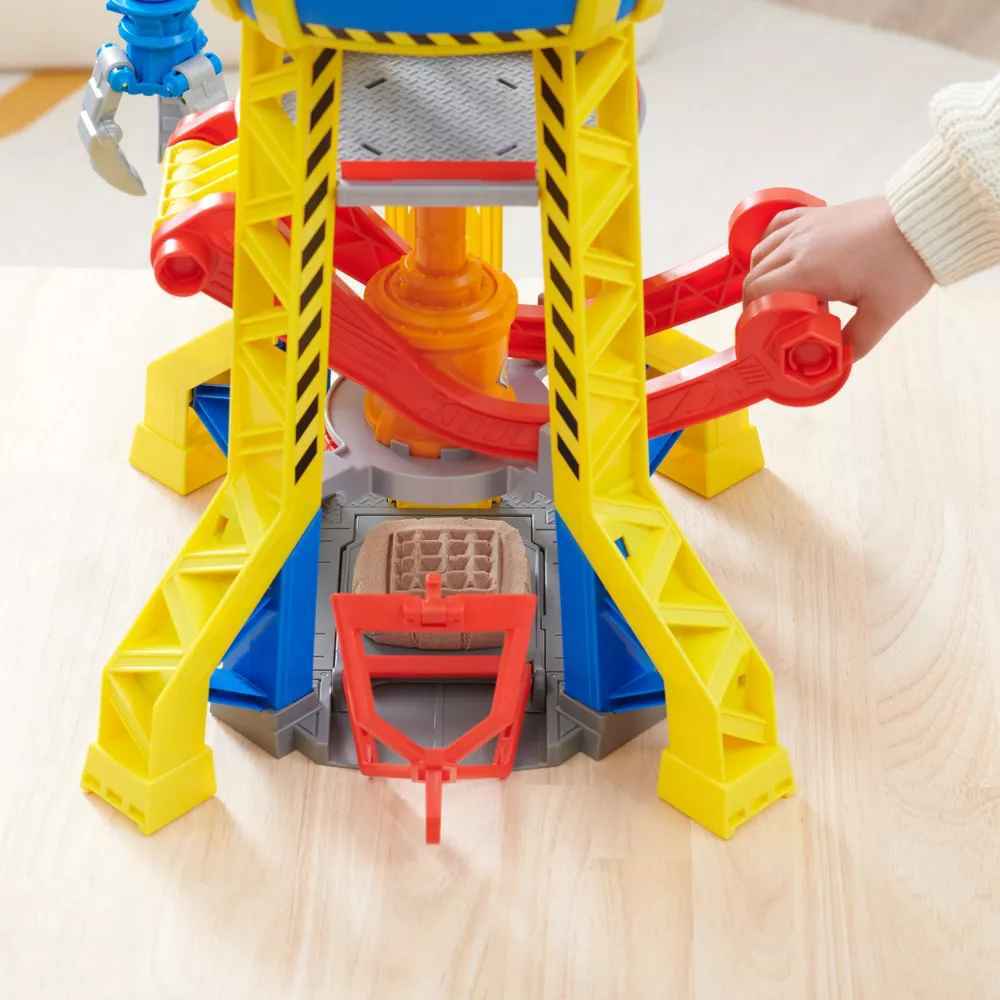 Get ready to ‘Bow-Wow Build” with your favourite PAW Patrol pup, Rubble & a toy bulldozer with working construction tools, in the Rubble & Crew, Crane Tower Playset! The Crane Tower looks just like it does in the show and features exciting kids construction toys like a rotatable crane toy, with an additional claw attachment, that kids can use to hoist things up and down! The tower also includes a Kinetic Build-It compound moulding system that lets you load two of the double sided moulds, with either a red or brown kinetic sand compound, and then pull down on the giant red lever to lower the impactor and form your own building blocks and place them on the base platform! Once your blocks are ready, place Rubble in the elevator and raise him to the top of the tower, and into the crane control pod, then use the crane to lift the blocks and move them where you want them! Then, for one last surprise, push the giant red button at the front of the tower to activate the lights and hear sounds and phrases that you know from the show! For even more exciting ways to play, look for all the Rubble & Crew construction truck toys and toy figures and playsets with Kinetic Build-It sand, along with the Bark Yard Workshop playset and to expand your world of pretend play building toys even more (each sold separately)! Bring the excitement of the Rubble & Crew series to life with the Crane Tower Playset!