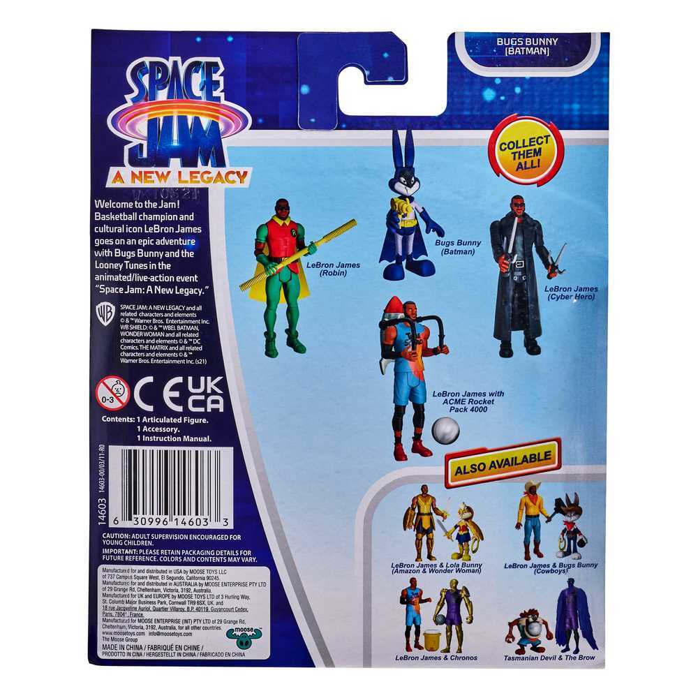 Welcome to the Jam! The Looney Tunes are back and have joined forces with Basketball Champion LeBron James on an epic cyberworld adventure in Space Jam: A New Legacy. This Baller Figure of Bugs Bunny dressed as Batman is 13cm (5") tall and articulated. It includes a Grapnel Launcher that attaches to his hand