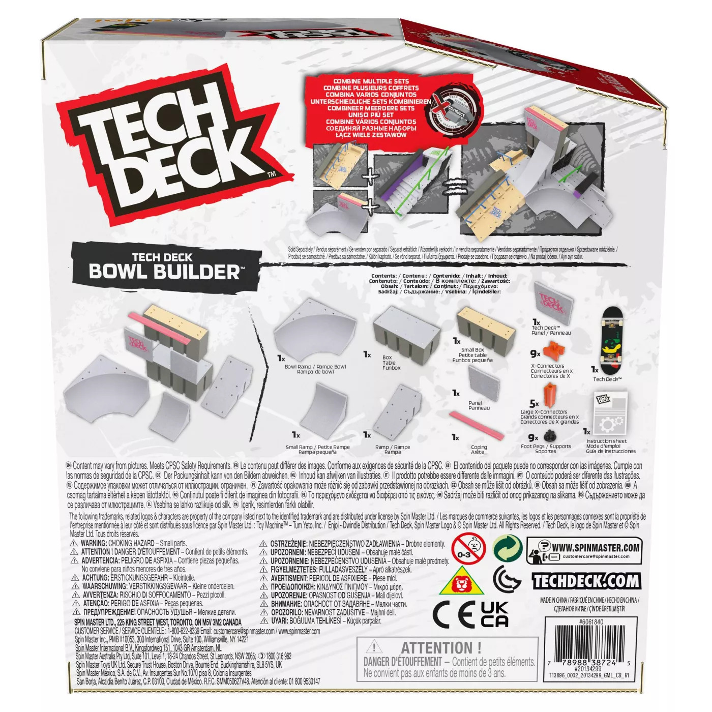 Includes: Tech Deck Fingerboard, Bowl Ramp, Small Ramp, Ramp, Small Box, Box, Panel, Tech Deck Panel, Coping, 9 X-Connectors, 5 Large X-Connectors, 9 Foot Pegs & Instruction Sheet
