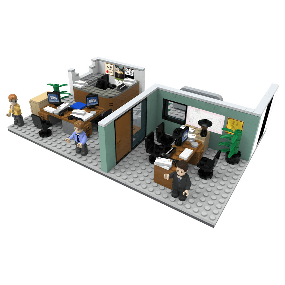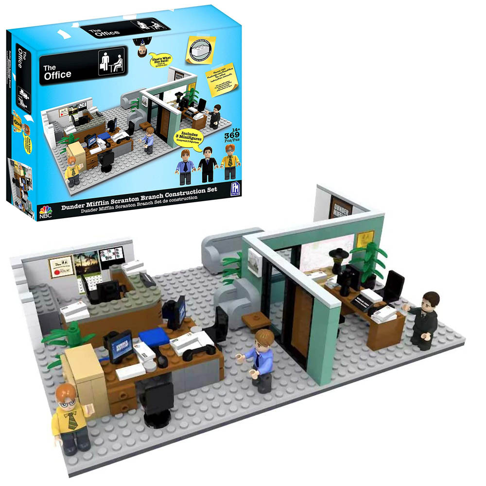 The office construction Set. In the box comes 369-piece buildable set of the Dunder Mifflin office, plus 3 collectable minifigures featuring fan favourites from The Office cast