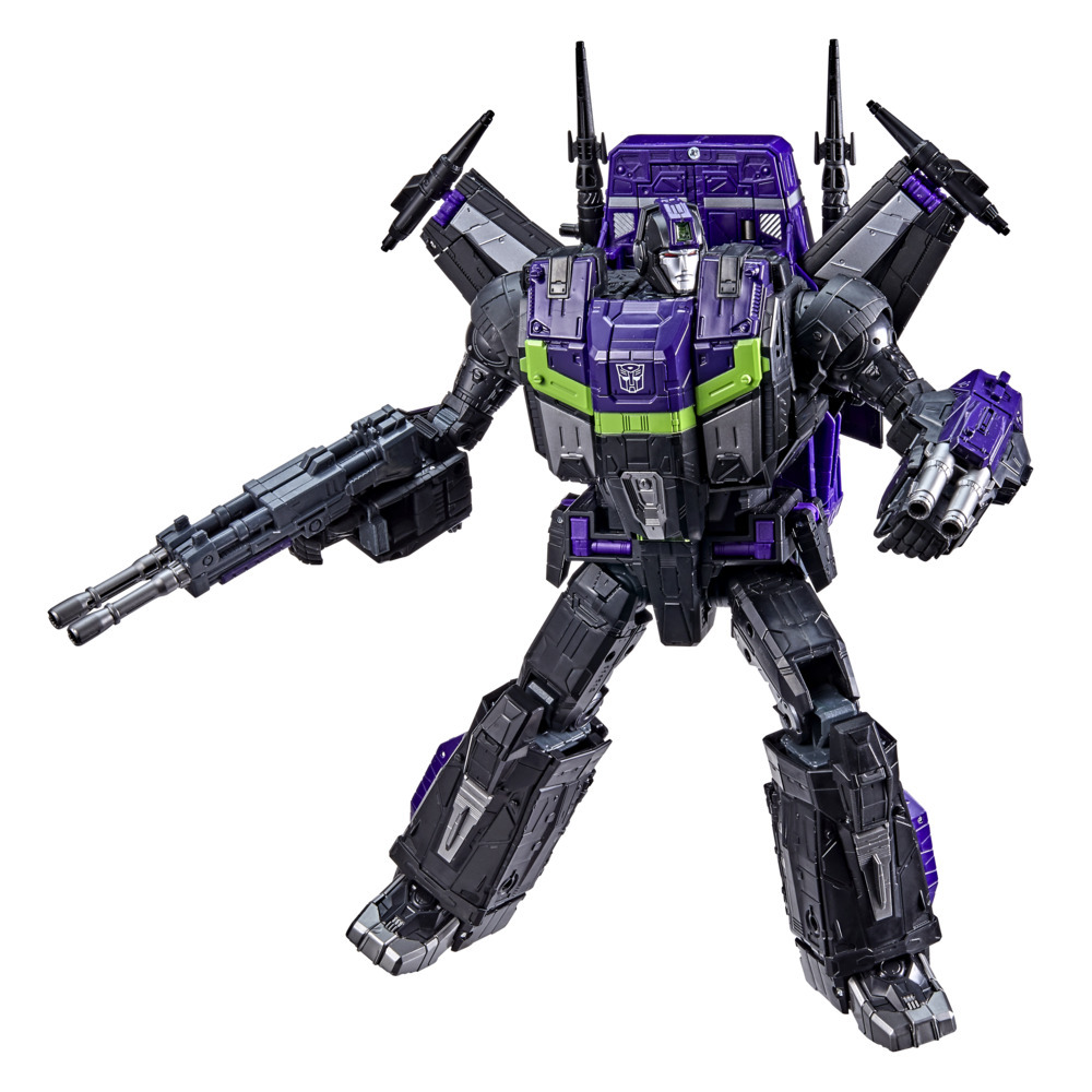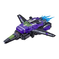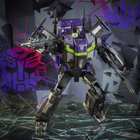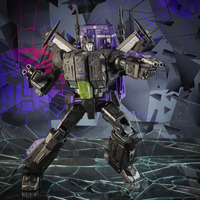 With conflicted loyalties to the Decepticon cause, Jetfire defected, joining the Autobots and their quest for universal conquest. This Jetfire figure converts from robot to Cybertronian jet mode in 36 steps. His deco is inspired by the Shattered Glass universe, including a purple Autobot logo. Autobot logo rotates to reveal red Decepticon logo. Comes with 12 armour and weapon accessories and 6 blast effects.