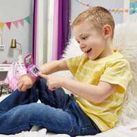 Attach Gabby to your wrist! Cute wristwatch featuring Gabby includes ten themed digital clock faces, time tools and four games. Gabby will guide you through games that include characters from the hit show Gabby’s Dollhouse. Help Gabby, Pandy Paws and Kitty Fairy collect the shape popcorn for snack time and match the foods to make milkshakes with Cakey Cat. Avoid obstacles and pick the right numbers to get MerCat’s tub back to the bathroom. Identify different shapes while doing shape crafting with Crafty Cat. Time tools include a stopwatch, timer and alarm clock. Meowzers!