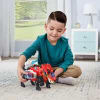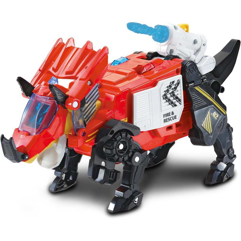 Switch & Go Hero the Triceratops Roll out with Switch & Go Dinos Hero the Triceratops by VTech! Easily switch this mighty Triceratops into a heroic blazing-fast fire engine that features lights, fun phrases, cool sound effects and an animated firefighter. Activate the water cannon to launch the water projectile to get flames under control!