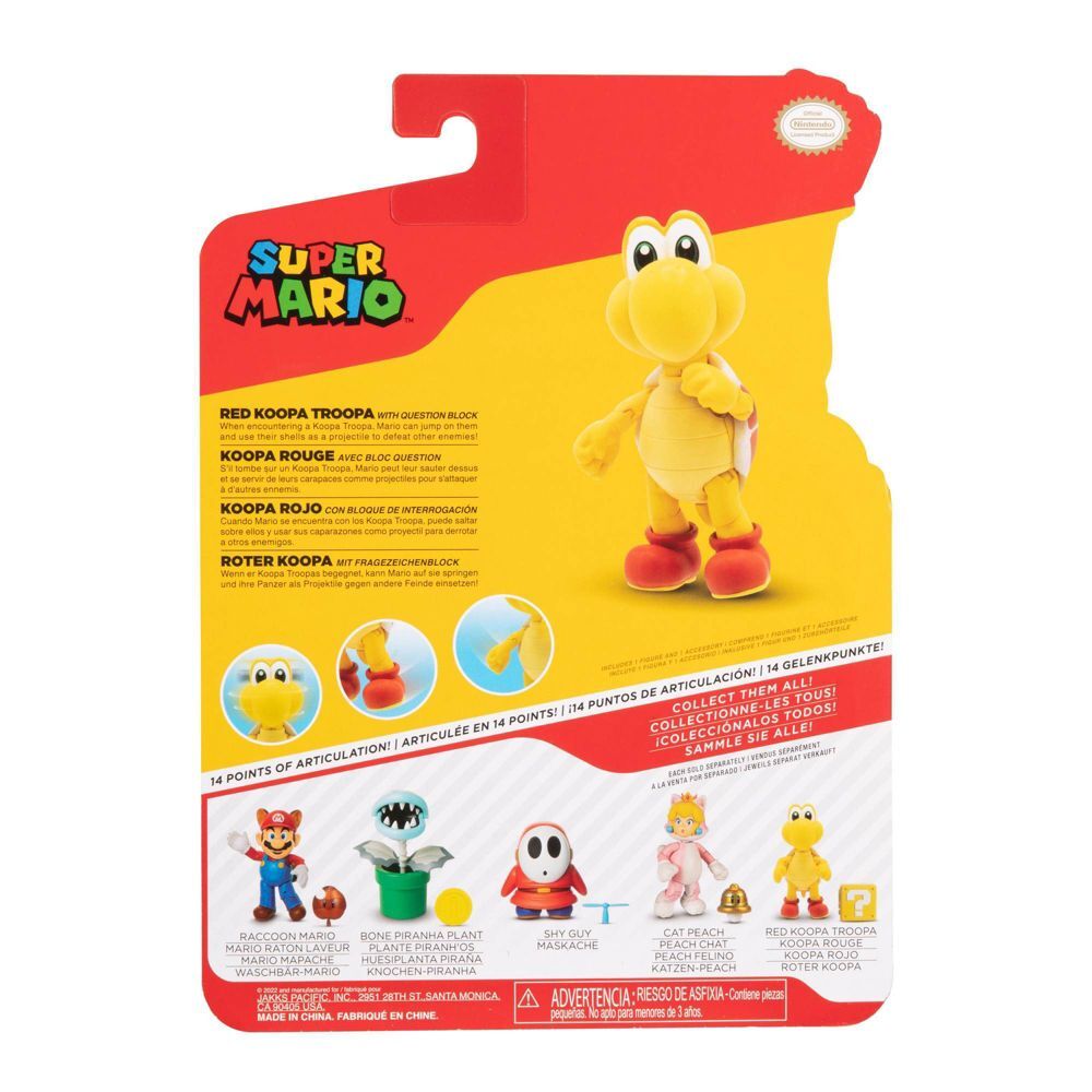 The Red Koopa Troopa 10cm (4”) figure is sure to be hit with kids and Nintendo fans! This authentic and poseable figure has 14 points of articulation and comes with a question block accessory. You can recreate the action from the games with this extraordinarily detailed figure and start your collection today.